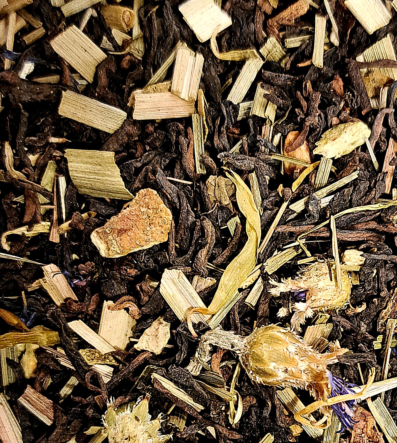 Tè Pu Erh Cina di agricoltura biologica, con bergamotto, scorze di arancia, scorze di limone, pompelmo, citronella e petali di girasole.