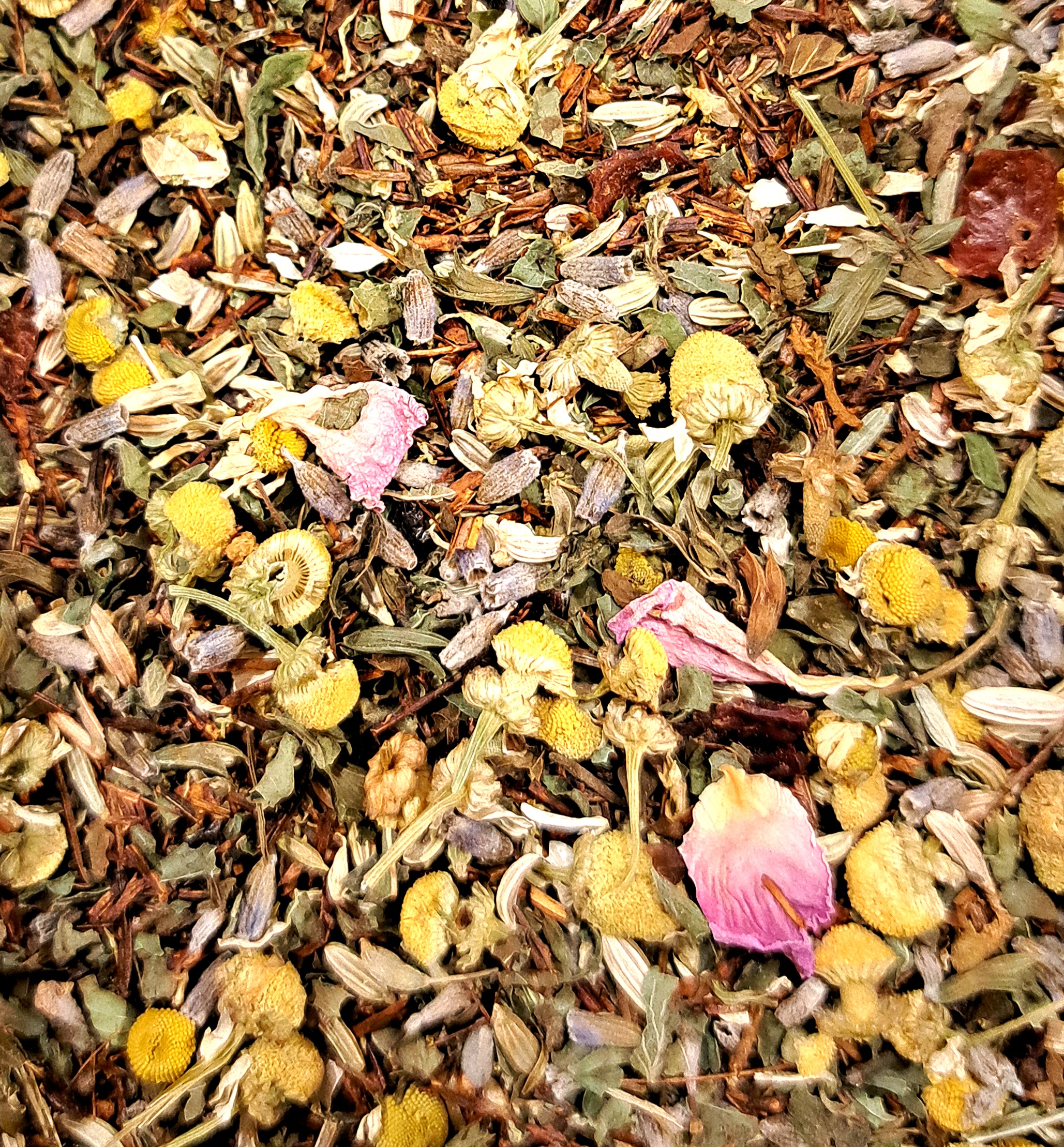 Tisana con Rooibos, semi di finocchio, bucce di rosa canina, fiori di camomilla, foglie di melissa, fiori di lavanda, foglie di fiori di rosa